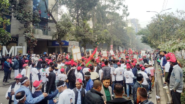 দলের কেন্দ্রীয় নেতাদের সঙ্গে নিয়ে লাল-সবুজ রঙের বুলেটপ্রুফ বাসে ধীর গতিতে এগোচ্ছিল তার বহর। সেনাবাহিনী, বিজিবি ও পুলিশসহ বিপুলসংখ্যক আইনশৃঙ্খলা রক্ষাকারী বাহিনীর কড়া নিরাপত্তায় চলছিল বাসটি।