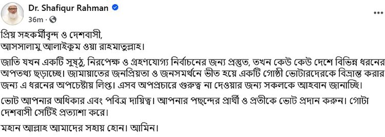 ফেসবুকের ওই পোস্টে জামায়াত আমির বলেন, ‘জাতি যখন একটি সুষ্ঠু, নিরপেক্ষ ও গ্রহণযোগ্য নির্বাচনের জন্য প্রস্তুত, তখন কেউ কেউ দেশে বিভিন্ন ধরনের অপতথ্য ছড়াচ্ছে। জামায়াতের জনপ্রিয়তা ও জনসমর্থনে ভীত হয়ে একটি গোষ্ঠী ভোটারদের বিভ্রান্ত করার জন্য এ ধরনের অপচেষ্টায় লিপ্ত। এসব অপপ্রচারে গুরুত্ব না দেওয়ার জন্য সকলকে আহ্বান জানাচ্ছি।’