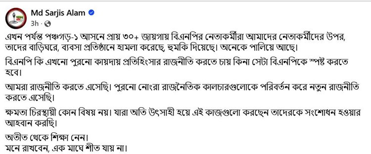 আরেকটি পোস্টে বিএনপিকে হুঁশিয়ারি দিয়ে সারজিস বলেন, ‘৪৮ শতাংশ মানুষকে প্রতিপক্ষ বানিয়ে পঞ্চগড়-১ আসনে বিএনপি যদি রাজনীতি করতে চায় তাহলে এর মূল্য তাদের চুকাতে হবে। হয় সন্ত্রাসী কার্যক্রম বন্ধ করুন, না হয় আমরা রাজনৈতিকভাবে মোকাবিলা করব। দেখি আপনারা কত পারেন, আর আমরা কত পারি।’