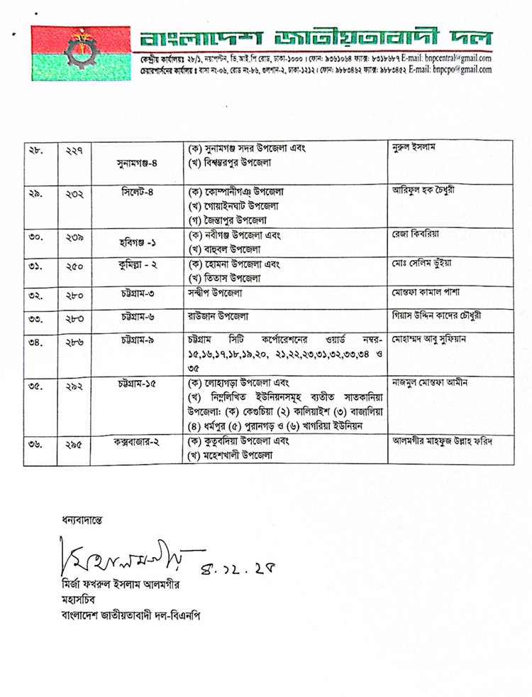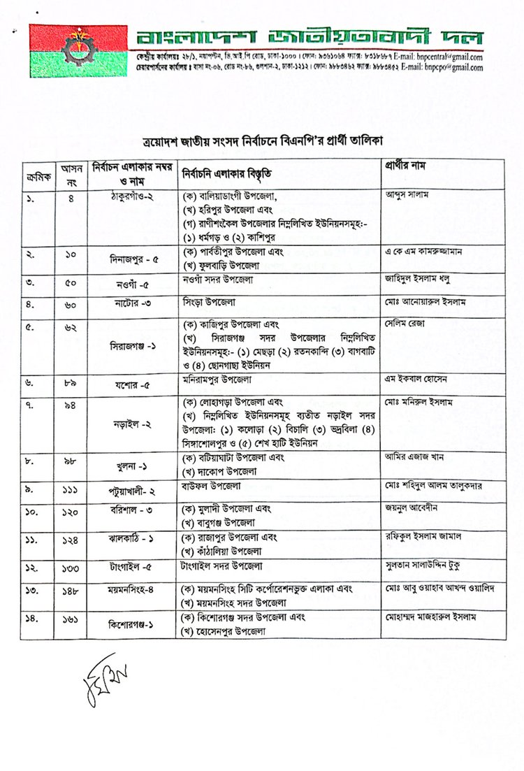 দলের মহাসচিব মির্জা ফখরুল ইসলাম আলমগীর আজ বৃহস্পতিবার বিকেলে গুলশানে চেয়ারপারসনের কার্যালয়ে এক সংবাদ সম্মেলনে এই ৩৬ আসনে প্রার্থীদের নাম ঘোষণা করেন।