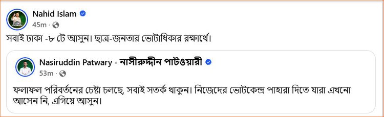 নাহিদ ইসলামের শেয়ার করা নাসীরুদ্দীন পাটওয়ারীর ফেসবুক পোস্টে বলা হয়, ‘ফলাফল পরিবর্তনের চেষ্টা চলছে, সবাই সতর্ক থাকুন। নিজেদের ভোটকেন্দ্র পাহারা দিতে যারা এখনো আসেননি, এগিয়ে আসুন।’