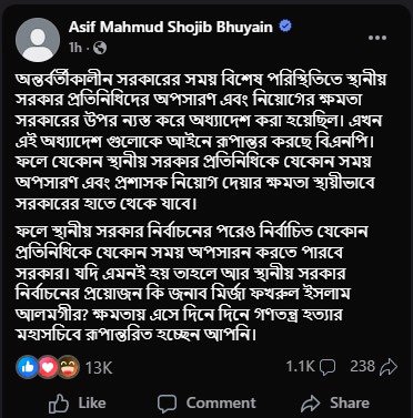 আসিফ মাহমুদ লিখেছেন, ‘অন্তর্বর্তীকালীন সরকারের সময় বিশেষ পরিস্থিতিতে স্থানীয় সরকার প্রতিনিধিদের অপসারণ এবং নিয়োগের ক্ষমতা সরকারের উপর ন্যস্ত করে অধ্যাদেশ করা হয়েছিল। এখন এই অধ্যাদেশ গুলোকে আইনে রূপান্তর করছে বিএনপি। ফলে যেকোন স্থানীয় সরকার প্রতিনিধিকে যেকোন সময় অপসারণ এবং প্রশাসক নিয়োগ দেয়ার ক্ষমতা স্থায়ীভাবে সরকারের হাতে থেকে যাবে। ফলে স্থানীয় সরকার নির্বাচনের পরেও নির্বাচিত যেকোন প্রতিনিধিকে যেকোন সময় অপসারণ করতে পারবে সরকার।’