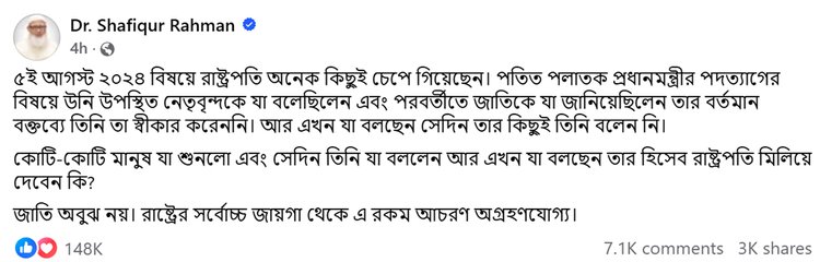 পোস্টে বলা হয়, ‘৫ই আগস্ট ২০২৪ বিষয়ে রাষ্ট্রপতি অনেক কিছুই চেপে গিয়েছেন। পতিত পলাতক প্রধানমন্ত্রীর পদত্যাগের বিষয়ে উনি উপস্থিত নেতৃবৃন্দকে যা বলেছিলেন এবং পরবর্তীতে জাতিকে যা জানিয়েছিলেন তাঁর বর্তমান বক্তব্যে তিনি তা স্বীকার করেননি। আর এখন যা বলছেন, সেদিন তার কিছুই তিনি বলেননি।’