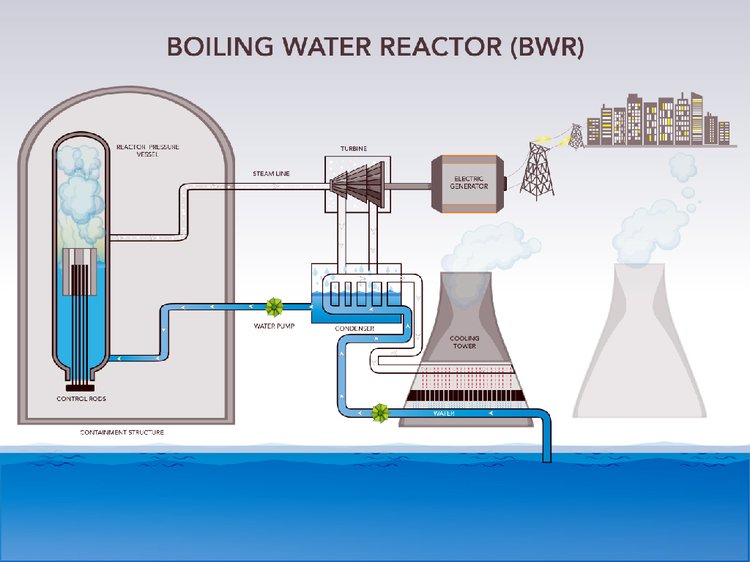 বয়েলিং ওয়াটার রিঅ্যাক্টর (বিডব্লিউআর): এই ব্যবস্থায় রিঅ্যাক্টর ভেসেলের ভেতরেই সরাসরি পানি ফুটিয়ে বাষ্প তৈরি করা হয় এবং সেই বাষ্প সরাসরি টারবাইন ঘোরাতে ব্যবহৃত হয়।