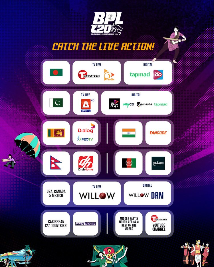 বাংলাদেশ ক্রিকেট বোর্ড (বিসিবি) গতকাল নিজেদের অফিশিয়াল ফেসবুক পেজে বিপিএল সম্প্রচারকারী চ্যানেলগুলোর নাম জানিয়েছে। বাংলাদেশে টেলিভিশনে টি স্পোর্টস ও নাগরিক টিভিতে দেখা যাবে এই ফ্র্যাঞ্চাইজি টুর্নামেন্ট। ডিজিটাল প্ল্যাটফর্ম আকাশ গো, ট্যাপম্যাড সম্প্রচার করবে বিপিএল। পাকিস্তানে এআরওয়াই স্পোর্টস চ্যানেলে দেখা যাবে বিপিএল। পাশাপাশি পাকিস্তানিরা এআরওয়াই জ্যাপ, ট্যাপম্যাড, মাইকো, তামাশা নামক ডিজিটাল প্ল্যাটফর্মে দেখতে পারেন বাংলাদেশের এই টুর্নামেন্ট। ভারতে ফ্যানকোডে দেখা যাবে বিপিএল। বাংলাদেশের এই ফ্র্যাঞ্চাইজিভিত্তিক টুর্নামেন্ট শ্রীলঙ্কায় ডায়লগ, পিও টিভি সম্প্রচার করবে।