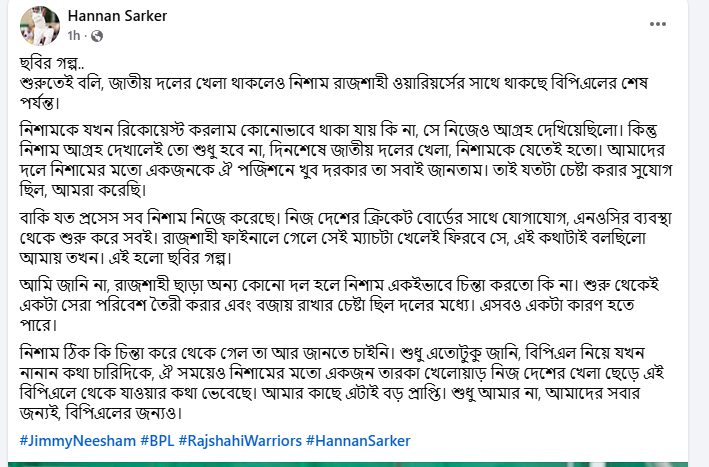 নিশাম যে বিপিএলে শেষ পর্যন্ত খেলবেন, সেটা নিশ্চিত করেছেন রাজশাহী ওয়ারিয়র্সের প্রধান কোচ হান্নান সরকার। ফেসবুকে তিনি লিখেছেন, 'জাতীয় দলের খেলা থাকলেও নিশাম রাজশাহী ওয়ারিয়র্সের সঙ্গে বিপিএলের শেষ পর্যন্ত থাকছে। নিশামকে যখন অনুরোধ করলাম কোনোভাবে থাকা যায় কি না, সে নিজেও আগ্রহ দেখিয়েছিল। কিন্তু নিশাম আগ্রহ দেখালেই তো শুধু হবে না। দিন শেষে জাতীয় দলের খেলা। নিশামকে যেতেই হতো। আমাদের দলে নিশামের মতো কাউকে যে খুব দরকার, সেটা আমরা সবাই জানতাম। একজনকে ঐ পজিশনে খুব দরকার তা সবাই জানতাম। যতটা চেষ্টা করার সুযোগ ছিল, করেছি আমরা।’