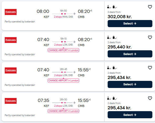 যে চার রুটের সূচি পোস্ট করেছে আইসল্যান্ড, তার মধ্যে প্রথম দুটি তো ওপরে বলাই হলো। তৃতীয় সূচি অনুযায়ী কেফলাভিক বিমানবন্দর থেকে ২৬ ঘণ্টা ৪৫ মিনিটের যাত্রা শেষে আইসল্যান্ড দল পৌঁছাবে কলম্বোতে। মাঝে লন্ডন, দুবাইয়ে যাত্রাবিরতি নেবে। আর চতুর্থ সূচি অনুযায়ী ৯ ঘণ্টা ১০ মিনিটের যাত্রা শেষে আইসল্যান্ড দল পৌঁছাবে কলম্বোতে। মাঝে লন্ডন, দুবাই বিমানবন্দরে বিশ্রাম নেবে।